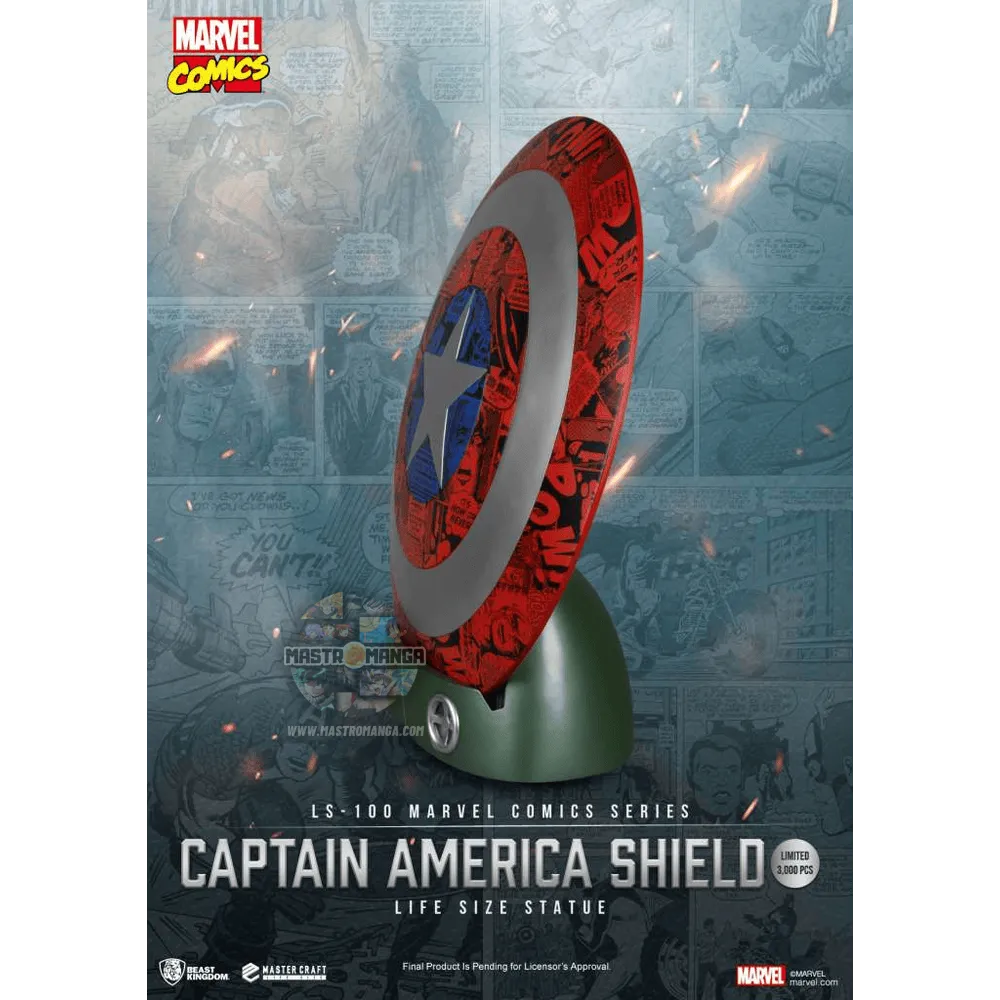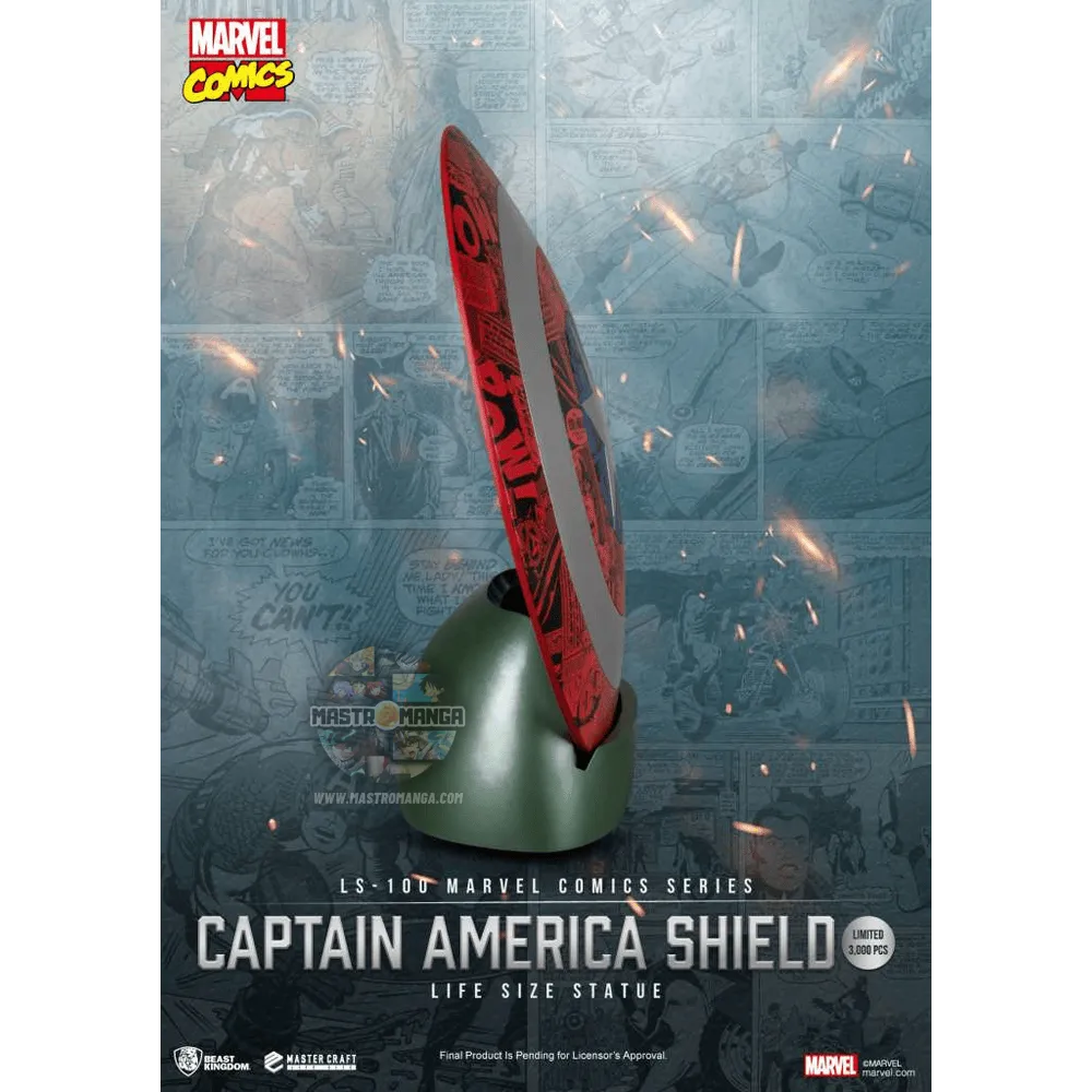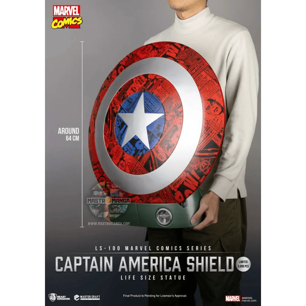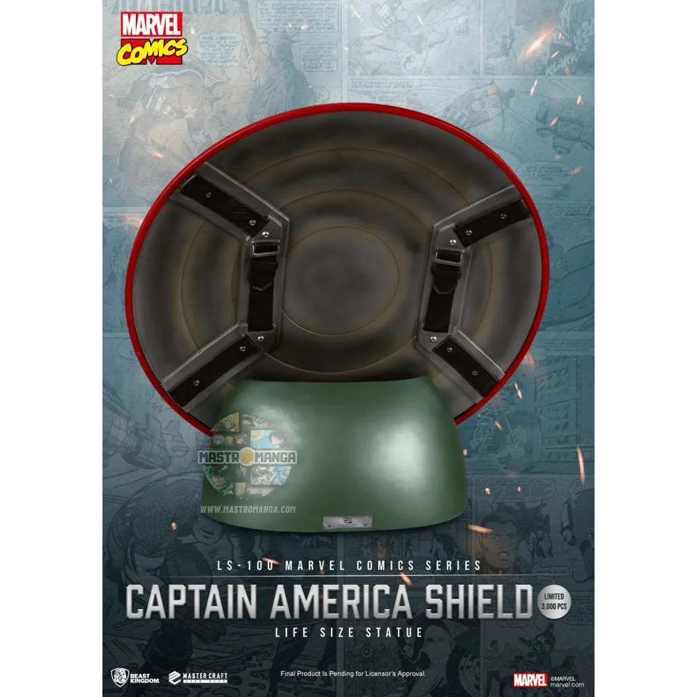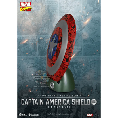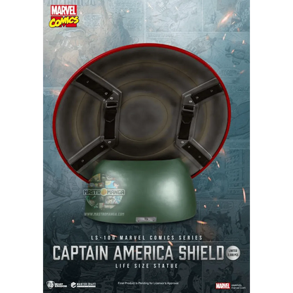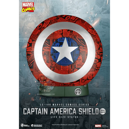 La serie Master Craft di Beast Kingdom presenta la statua a grandezza naturale dello Scudo di Capitan America della serie LS-100 Marvel Comics, meticolosamente realizzata con vernice multistrato rossa, blu e argento per una raffinata finitura metallica. L'esclusiva base espositiva, ispirata alla Camera del Super Soldato, rende omaggio alle sue origini eroiche, esaltandone il valore collezionistico.