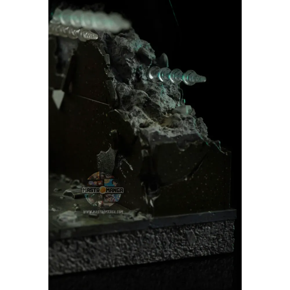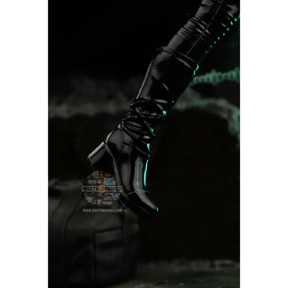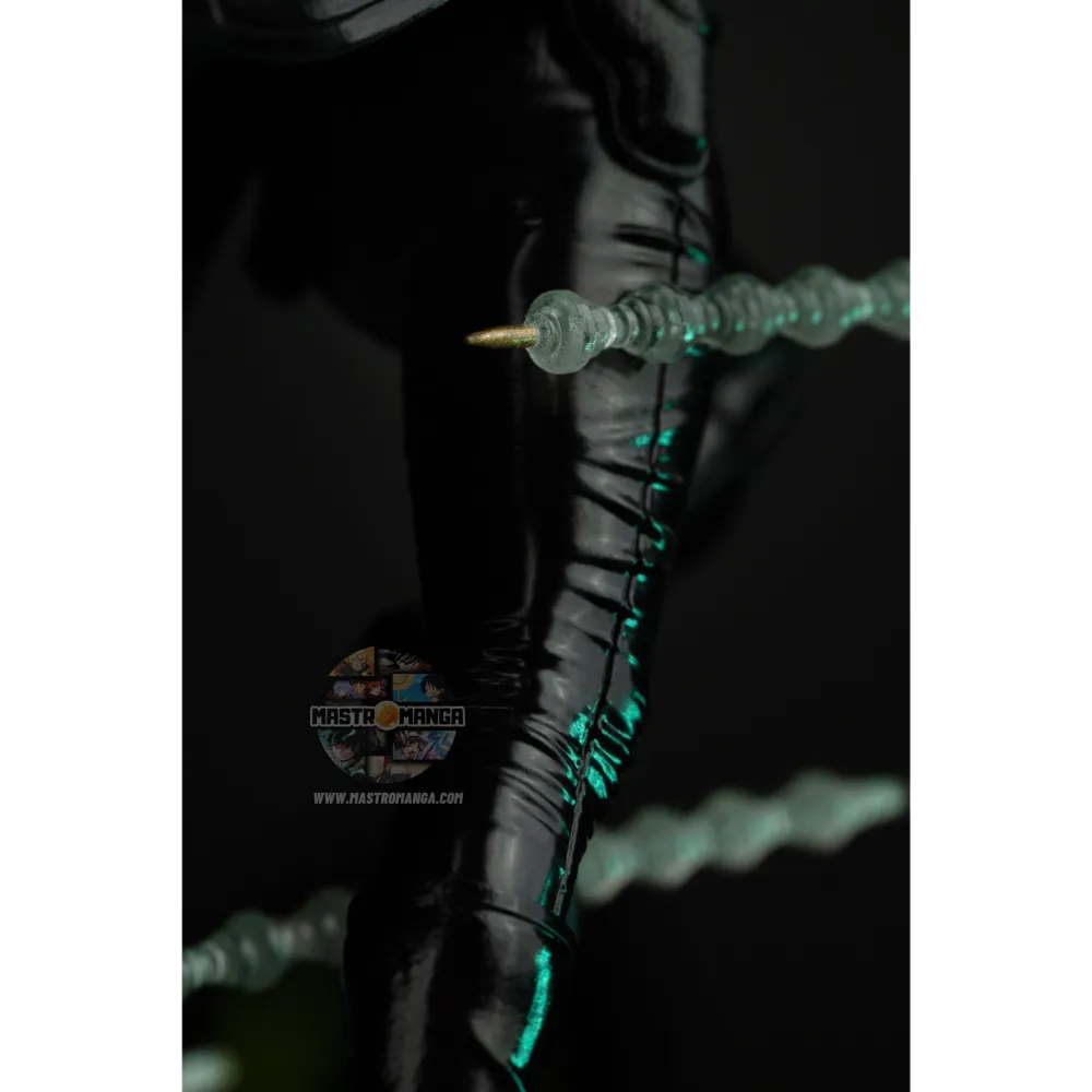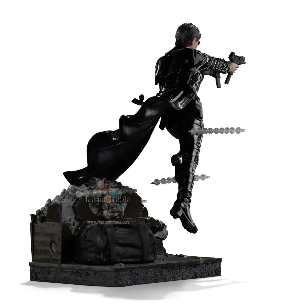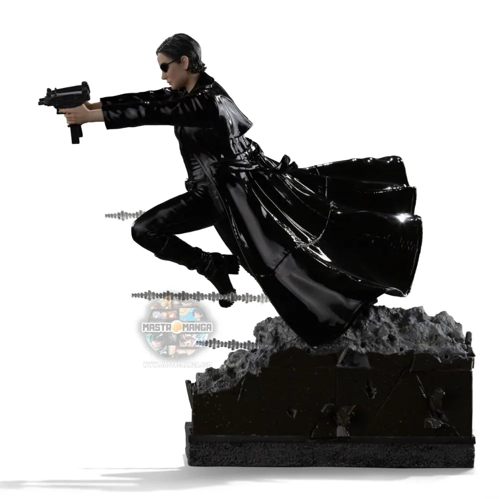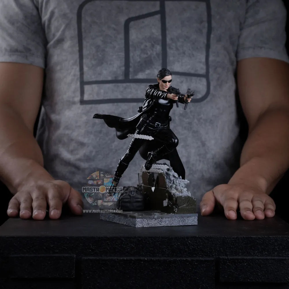 La figura mostra Trinity in una posa dinamica, pronta all’azione, con i suoi celebri occhiali neri, l’elegante tuta in pelle e le armi doppie impugnate, mentre salta nel vuoto sfidando le leggi della fisica, in pieno stile bullet time. La base scenica richiama l’estetica distopica della Matrix, completando un diorama dallo straordinario impatto visivo.