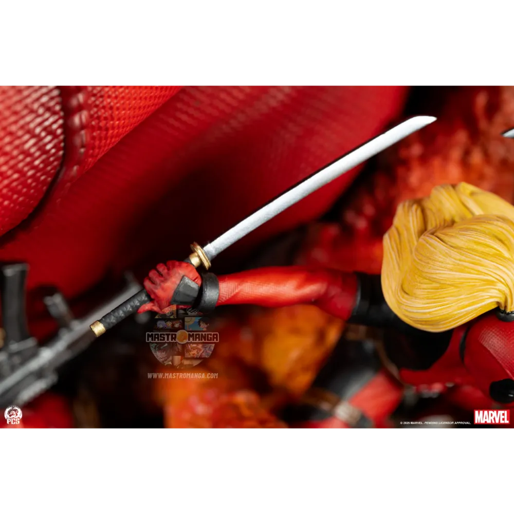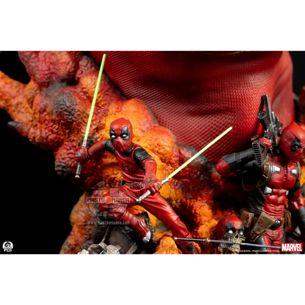Con un’altezza di 42 cm e una larghezza di 27 cm, questa straordinaria opera d’arte rappresenta una scena dinamica a 360 gradi che mostra il caotico mondo di Deadpool e dei suoi compagni, noti in alcuni ambienti come la Deadpool Corps.