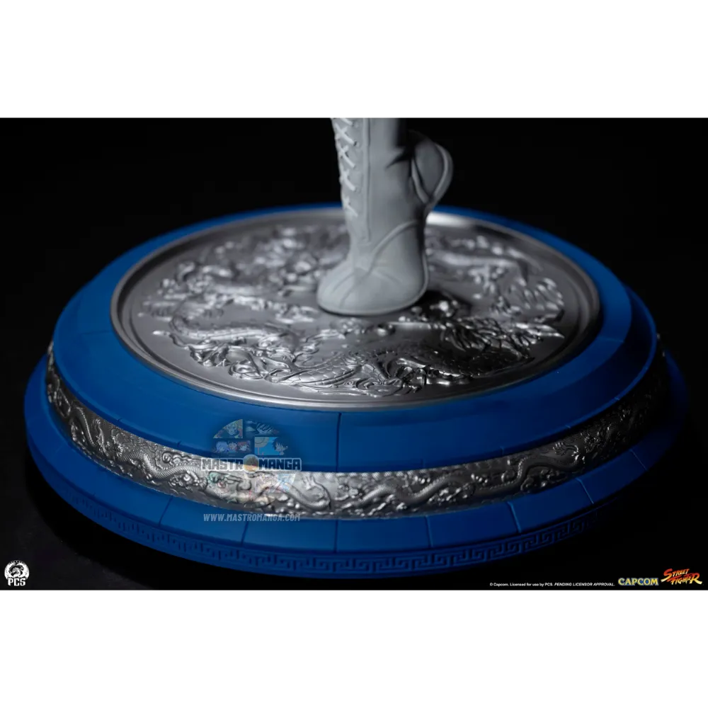 La statua di Chun-Li Classic poggia su una base circolare a profilo basso, decorata con elementi della sua classica palette di colori e dettagli scolpiti ispirati alla sua cintura ricamata.