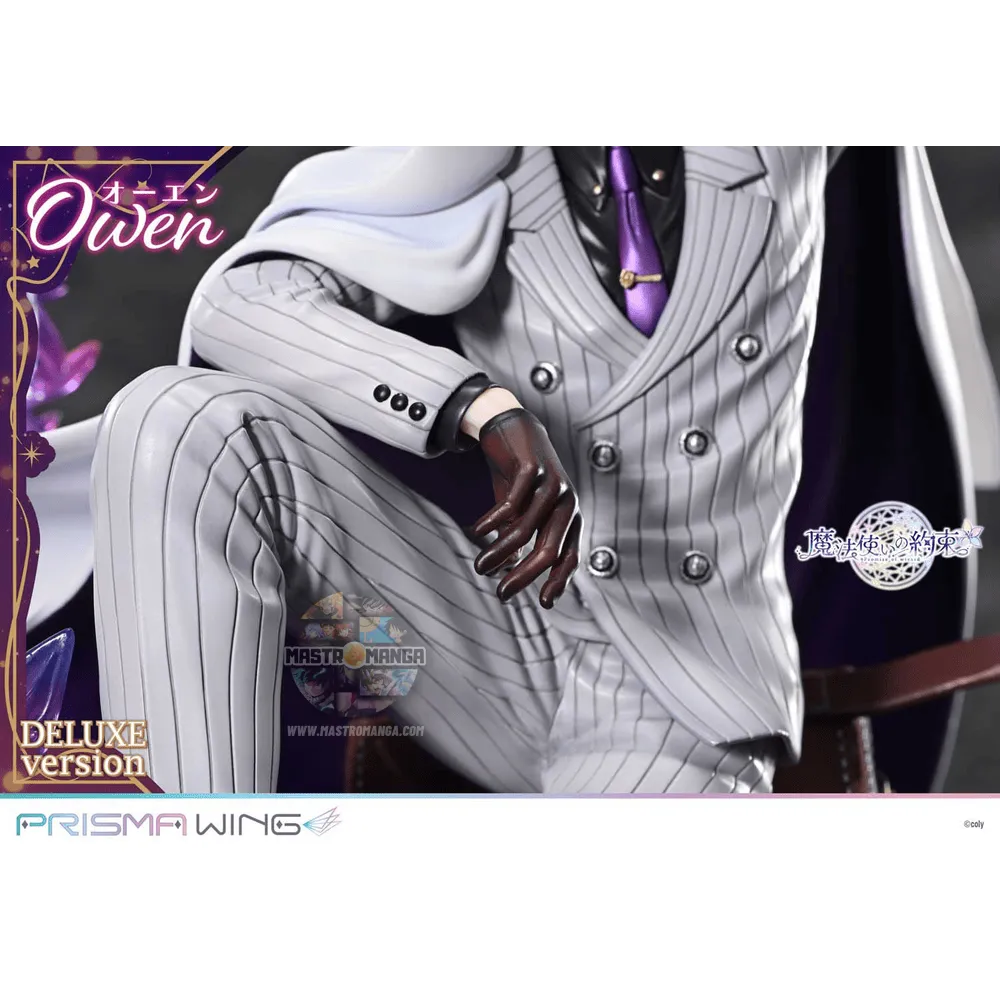 Vestito con il suo caratteristico abito a righe bianche, si siede in una posa rilassata con un sorriso freddo che irradia compostenza. Ogni elemento è stato meticolosamente realizzato per trasmettere la personalità unica di Owen. Le tonalità bianche e viola del suo mantello evocano i paesaggi innevati e le aurore, incarnando perfettamente l'essenza del Mago del Nord. I dettagli raffinati si estendono alla sua posa elegante mentre tiene delicatamente il suo cappello, così come le sue sofisticate scarpe bicolore. Dalla cravatta scolpita alla sottile ombreggiatura dei suoi guanti, ogni dettaglio ti invita ad ammirare la sua maestria.